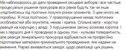 Крім того, вона підкреслила, що перебуває поза політикою, і для неї немає правопорушників з "політичним імунітетом". "З порушниками закону розмова коротка. І ми з першого дня її проводимо в одному тоні - нульова толерантність, але реакція генерального прокурора йде на професійно підготовлені матеріали кримінального провадження, яке дано на вивчення. Наразі вживаються заходи щодо реалізації цих рішень", - підсумувала генпрокурорка.