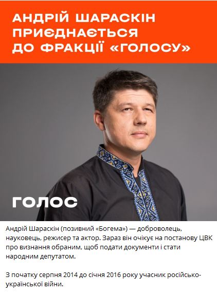 Ветеран російсько-української війни, доброволець з позивним "Богема" Андрій Шараскін приєднається до парламентської фракції "Голос". Зараз ЦВК готує постанову, після винесення якої Шараскін зможе подати документи на мандат народного депутата Верховної Ради.