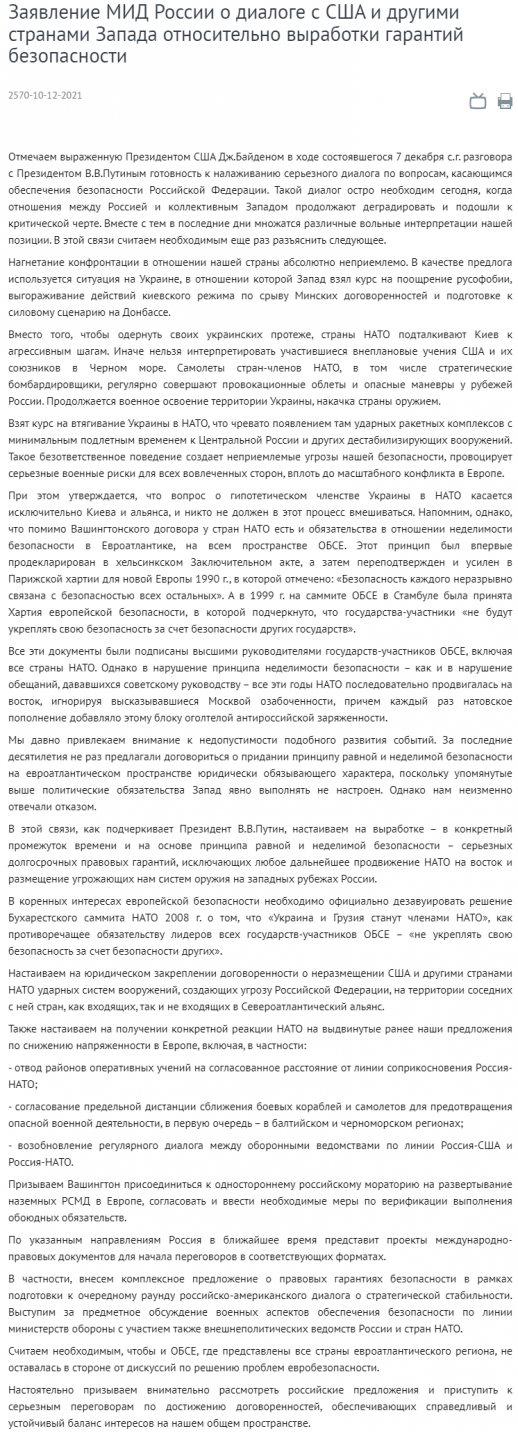"Взято курс на втягування України в НАТО, що загрожує появою там ударних ракетних комплексів з мінімальним підлітним часом до Центральної Росії та інших дестабілізуючих озброєнь. Така безвідповідальна поведінка створює неприйнятні загрози нашій безпеці, провокує серйозні військові ризики для всіх залучених сторін, аж до масштабного конфлікту в Європі", - наголошується у заяві російського відомства.