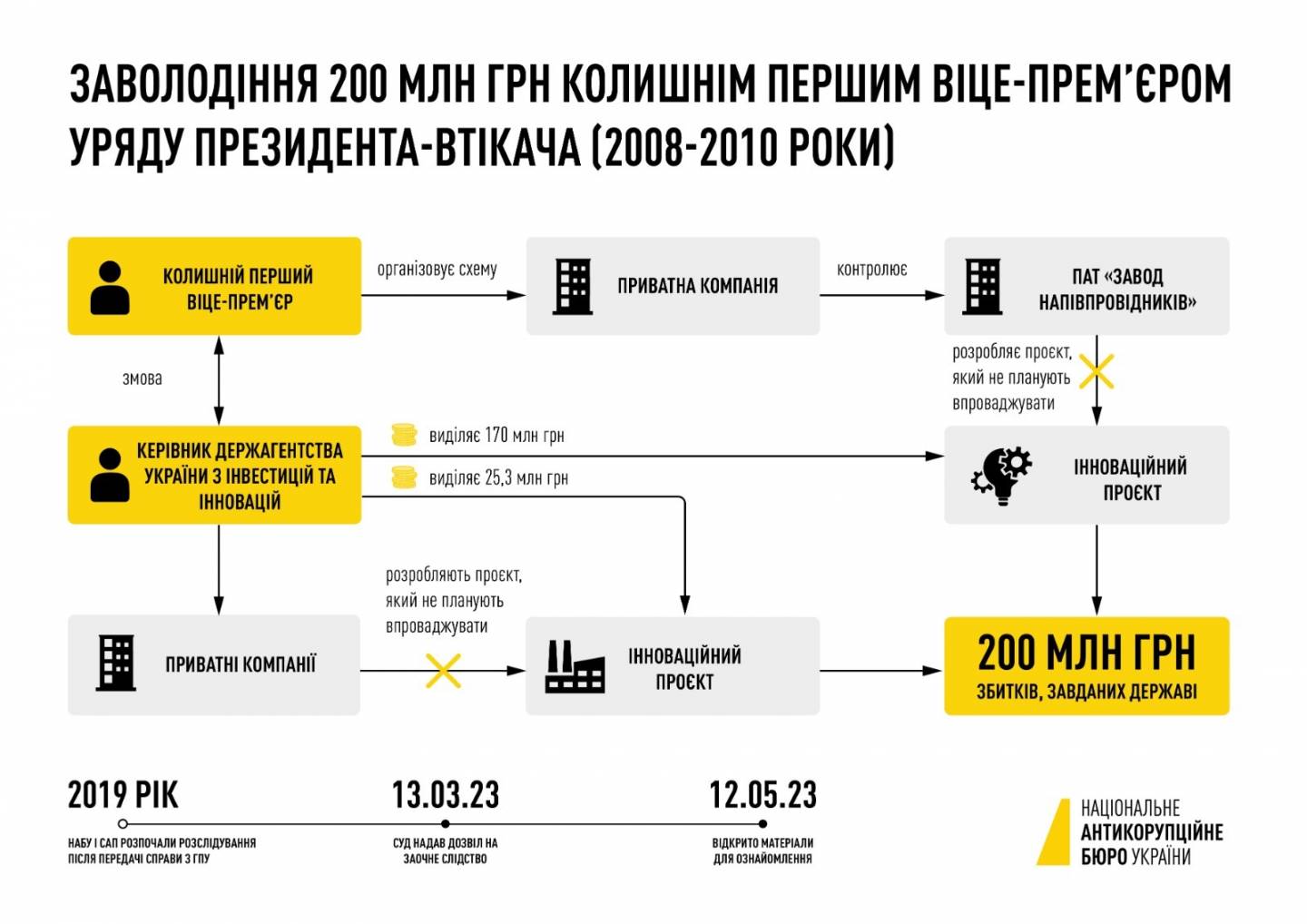 За даними слідства, у 2008 році підозрюваний колишній перший віце-прем’єр-міністр через підконтрольні фірми став фактичним бенефіціарним власником збиткового ВАТ «Завод напівпровідників». Згодом, у 2010 році, експосадовець у змові з тодішнім головою Держінвестицій забезпечив виділення бюджетних коштів нібито для розвитку інноваційного проєкту. Насправді, ніякий проєкт не планувався, а виділені Урядом 170 млн грн — розтратили.