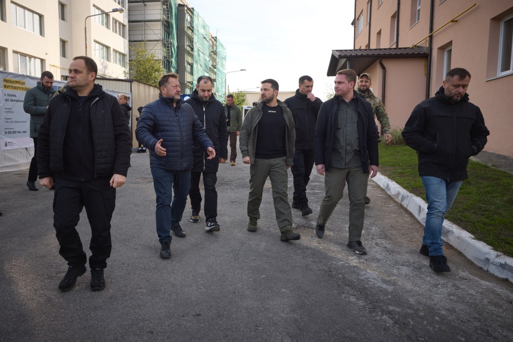 У селі Бузова Володимир Зеленський ознайомився з перебігом відновлювальних робіт у багатоквартирних будинках на вулиці Центральній.