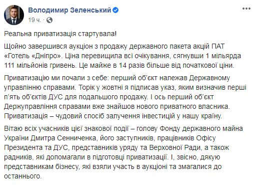 Президент України Володимир Зеленський заявив, що ціна продажу державного пакета акцій ПАТ "Готель "Дніпро" перевищила всі очікування, сягнувши 1 мільярда 111 мільйонів гривень. Це майже в 14 разів більше від початкової ціни. Президент нагадав, що минулого року у жовтні він підписав указ, яким визначив перші п’ять об’єктів ДУС для подальшого продажу.