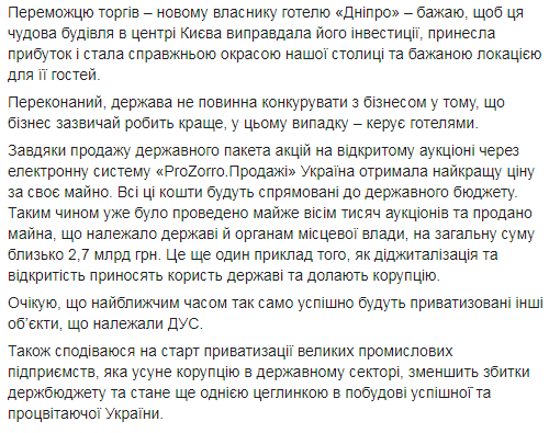 Зеленський привітав всіх учасників продажу – голову Фонду державного майна України Дмитра Сенниченка, його заступників, працівників Офісу Президента та ДУС, представників уряду та Верховної Ради, а також радників, які допомагали в підготовці приватизації. Зеленський також подякував представникам бізнесу, які взяли участь в аукціоні та змагалися до останнього. Зеленський зазначив, що держава не повинна конкурувати з бізнесом у тому, що бізнес зазвичай робить краще, у цьому випадку – керує готелями. Президент підкреслив, що завдяки продажу державного пакета акцій на відкритому аукціоні через електронну систему "ProZorro.Продажі" Україна отримала найкращу ціну за своє майно, а кошти спрямують до державного бюджету.