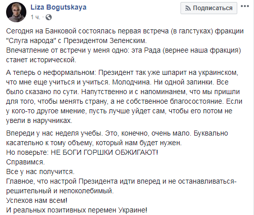 Про це у Facebook повідомила Ліза Богуцька, яка знаходиться на 95-му місці в списку "Слуги народу".