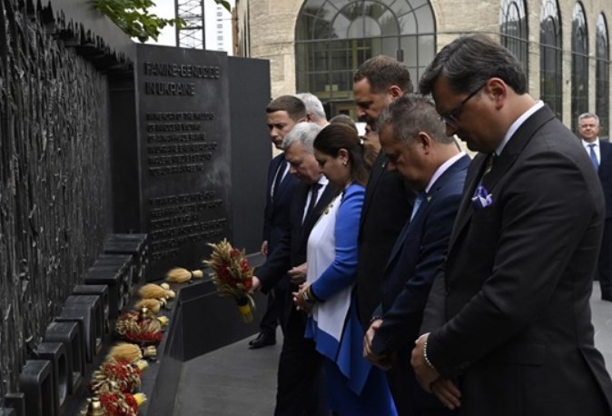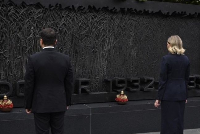 Керівник української держави з дружиною поклали символічні снопики пшениці до підніжжя Меморіалу. Представники офіційної делегації України вшанували жертв страшної трагедії українського народу та пригалади страшні стрінки історії нашого народу.
