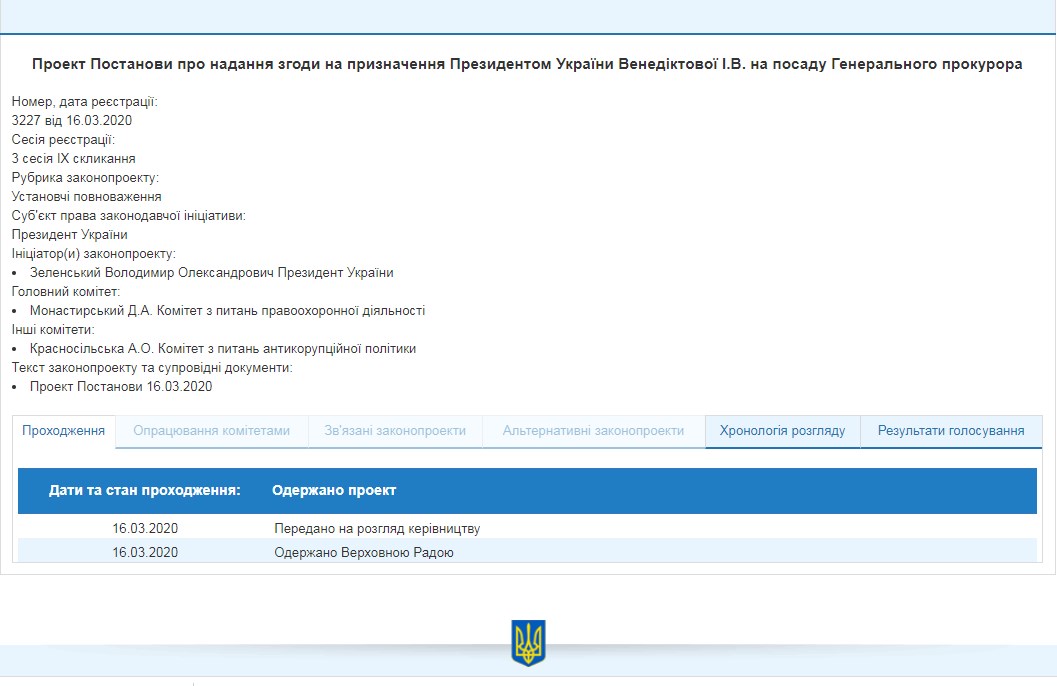 У Верховній Раді України за поданням президента Володимира Зеленського зареєстровано "Проєкт Постанови про надання згоди на призначення Президентом України Венедіктової І.В. на посаду Генерального прокурора" № 3227.