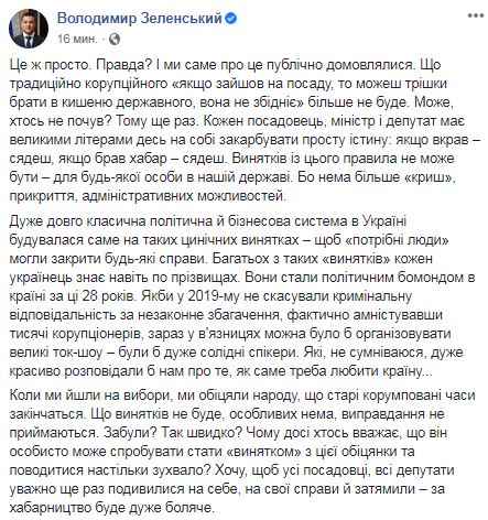 Зеленський також нагадав про передвиборчі обіцянки, які були дані "слугами" про те, що старі корумповані часи закінчаться, і винятків не буде ні для кого.