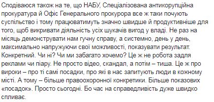 "Не раз у місяць демонструвати нам гучну справу, а системно, день у день, максимально напружуючи свої можливості, показувати результат. Конкретний. Чи ні? Чи ми занадто багато хочемо? Це ж не робота заради реклами або піару. Не просто відео, скандал, а потім - тиша. Це ж про вироки - про ті самі посадки, про які у нас запитують люди в кожному місті. А тому - більше правоохоронної конкретики. Більше показових "посадок". Прямо сьогодні. Бо час на справедливість дуже швидко спливає", - підсумував Володимир Зеленський.