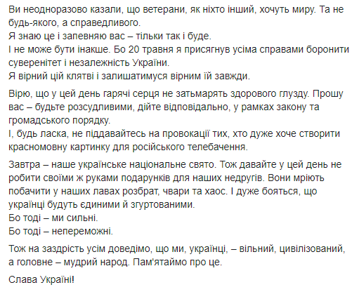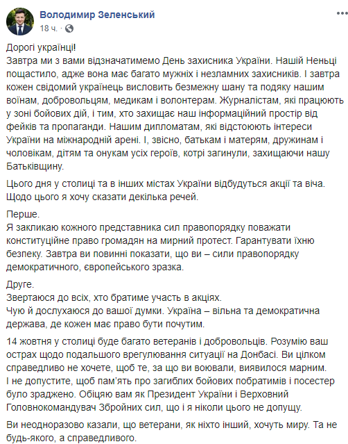 "14 жовтня у столиці буде багато ветеранів і добровольців. Розумію ваш острах щодо подальшого врегулювання ситуації на Донбасі. Ви цілком справедливо не хочете, щоб те, за що ви воювали, виявилося марним. І не допустите, щоб пам’ять про загиблих бойових побратимів і посестер було зраджено. Обіцяю вам як Президент України і Верховний Головнокомандувач Збройних сил, що і я ніколи цього не допущу", - написав Зеленський на своїй сторінці у Facebook.