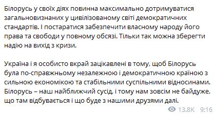 Заява була опублікована в Телеграм-каналі в понеділок, 10 серпня. Володимир Зеленський зазначив, що народ Білорусі "переживає зараз непрості часи".