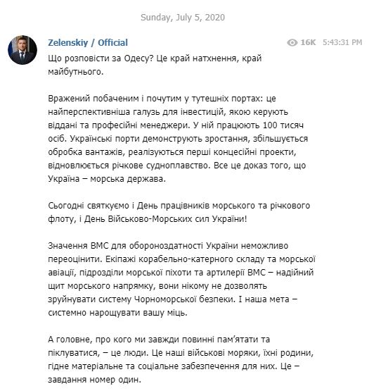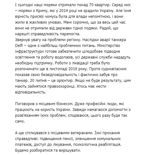 Зеленський вручив військовим морякам ключі від 70 квартир, а також привітав працівників морського та річкового флоту та військовослужбовців Військово-Морських сил України з професійним святом. Крім того, він провів зустріч з представниками місцевого бізнесу та ветеранами (він не уточнив, якими саме), а також проінспектував будівництво доріг і стадіонів у регіоні.