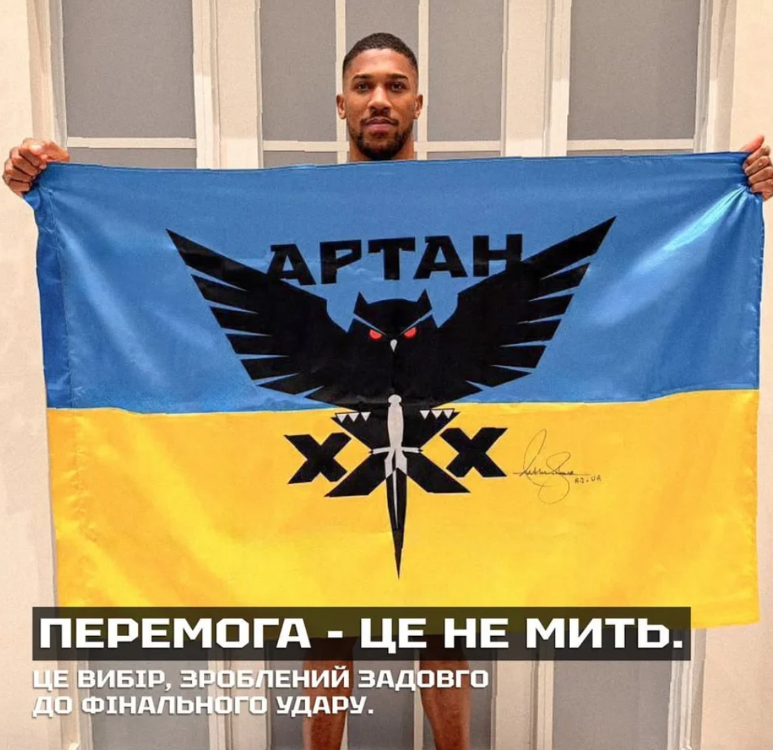 Британський боксер та колишній чемпіон світу у суперважкій вазі Ентоні Джошуа сфотографувався з українським прапором у руках, на якому зображений логотип спеціального підрозділу Головного управління розвідки МО України "Артан".