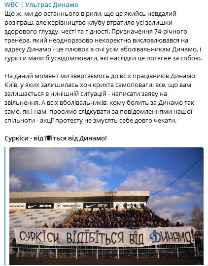 "Що ж, ми до останнього вірили, що це якийсь невдалий розіграш, але керівництво клубу втратило всі залишки здорового глузду, честі і гідності. Призначення 74-річного тренера, який неодноразово некоректно висловлювався на адресу Динамо - це плювок в очі всім уболівальникам Динамо і Суркіси повинні були б усвідомлювати, які наслідки це понесе за собою. Наразі ми звертаємося до всіх працівників Динамо Київ, у яких залишилася хоч крихта самоповаги: все, що вам залишається в нинішній ситуації - написати заяву на звільнення. А всіх уболівальників , кому болить за Динамо так само, як і нам, просимо стежити за повідомленнями нашого співтовариства - акції протесту не змусять себе довго чекати".