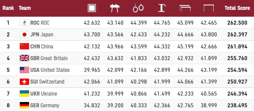 Олімпійський чемпіон Ігор в Ріо-2016 Олег Верняєв був відсторонений від змагання у Токіо через допінг. За відсутності Верняєва українську команду на Олімпіаді-2020 представляли Ігор Радівілов, Петро Пахнюк, Євген Юденков і Ілля Ковтун. Але поборотися за медалі у такому складі українці не змогли. У командному змаганні спортсмени змагаються у вправах на коні, кільцях, паралельних брусах, перекладині, опорному стрибку і у вільних вправах. Золоті медалі дісталися команді РОК, срібло у Японії, а бронзу завоювала команда Китаю, повідомляє "Сьогодні".