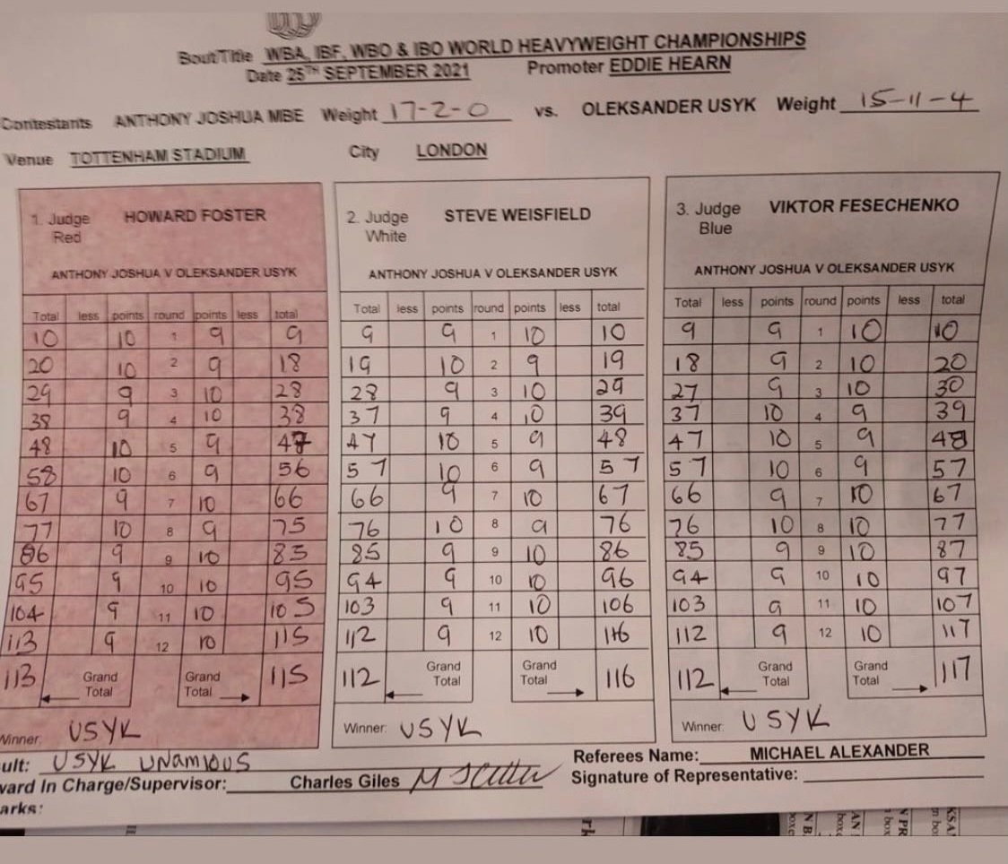 Під час суддівства бою українського боксера Олександра Усика та його супротивника з Британії Ентоні Джошуа рефері зійшлися в одностайному рішенні про перемогу Усика з рахунком 117:112, 116:112 і 115:113. Але їхня оцінка бою двох раундів різниться.