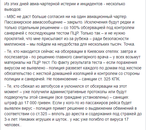 "Якщо у когось із пасажирів рейсу буде виявлений вірус — поліція прийме рішення про висунення звинувачень у відповідності зі ст. 325 — аж до арешту і утримання під вартою до 3-х років", — повідомив глава МВС.