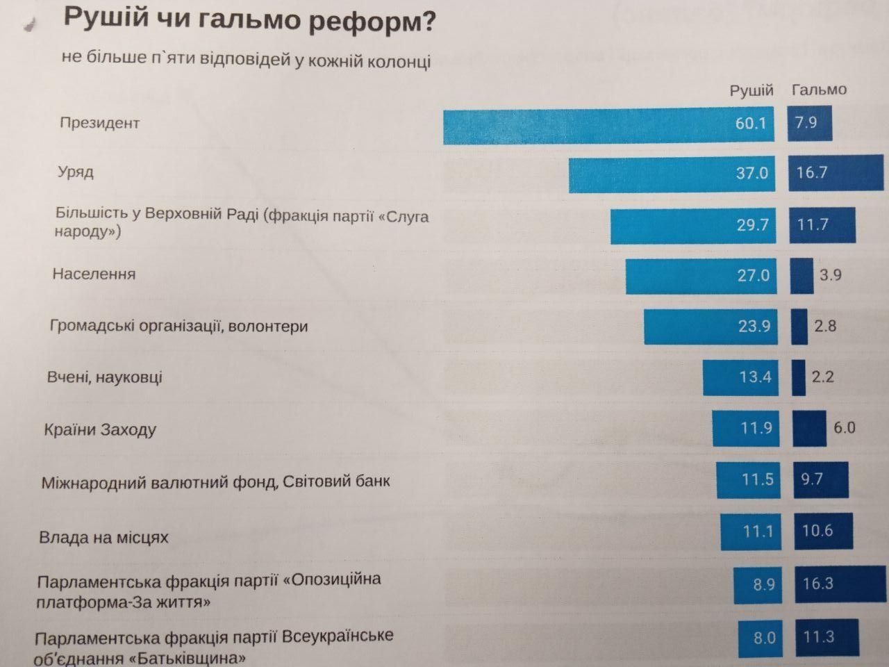 Головним двигуном реформ 60% українців вважають президента. Більше третини громадян також покладаються на уряд (37%) і фракцію "Слуга народу" (30%).