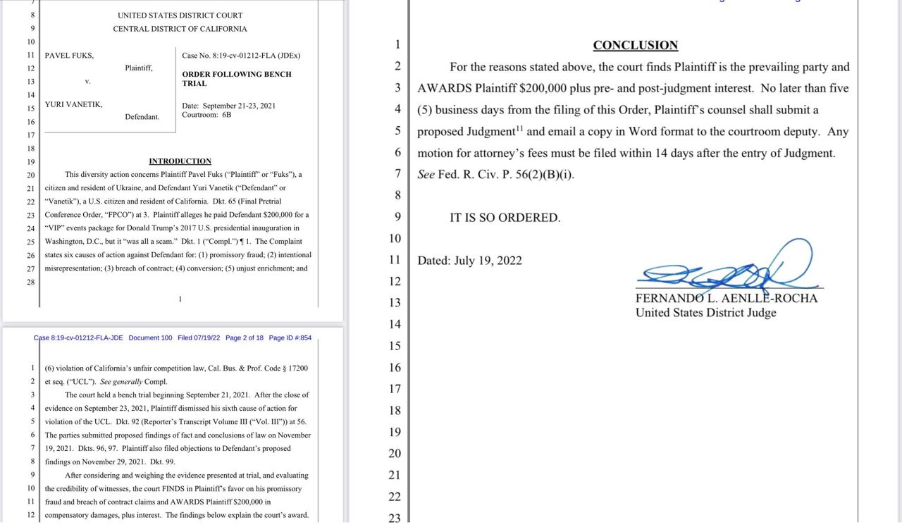 Бізнесмен Фукс виграв у США суд проти політконсультанта Ванетика щодо квитка на інавгурацію Трампа (Фото)