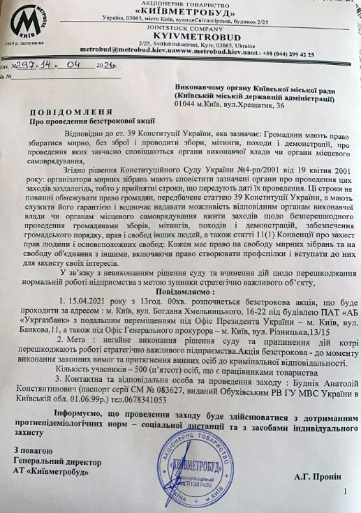 Як повідомили ASPI news організатори, акція відбудеться завтра, 15 квітня 2021 року, о 13:00 під головним офісом "Укргазбанку" в Києві по вулиці Богдана Хмельницького, 16/22. Очікується близько 100 учасників протесту з-поміж співробітників АТ "Київметробуд", котрі завтра мають вихідний та не беруть участь у роботах на будмайданчиках двох станцій метро "Мостицька" та "Проспект Правди" на Виноградар.