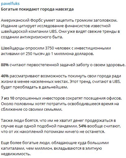 "Як мінімум, для когось відкриються нові можливості. Тому що разом з грошима багатіїв за міську межу мігрують цілі бізнес-ніші. Торгові центри. Платні школи. Всілякі сервіси — від будівельних послуг і до доставлення. Поки хтось витрачає накопичення, іншим потрібно спробувати використати кризу на свою користь. До такого висновку приходить Forbes. Тут я з ним погоджуся", - пише у своїй публікації меценат Павло Фукс.