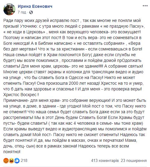 Усі, хто піде в неділю до церкви з щирим бажанням вшанувати Бога, не захворіють. Таке у вівторок, 14 квітня, написала на своїй сторінці у Facebook депутатка Одеської міської ради Ірина Єсенович.