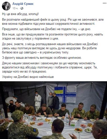 "Ну це вже абсурд, хлопці! Ви розігнали найдивніший фейк у цьому році. Рік ще не закінчився, але вже можна підбивати підсумки вашої сюрреалістичної активності. Придумати, що військовим на Донбасі не подали їжу, - це дно", - заявив голова ОП .