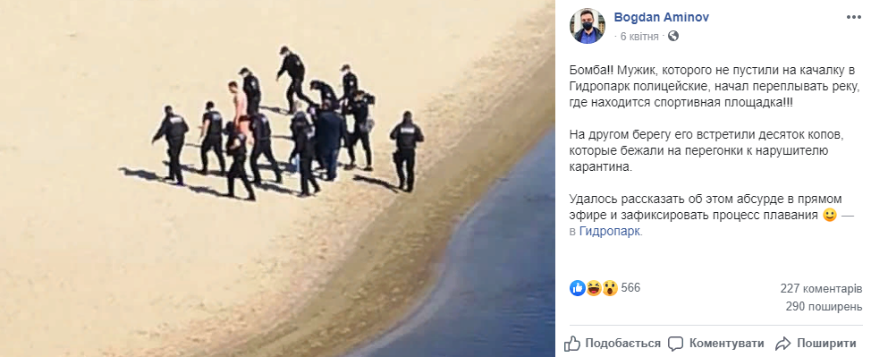 Раніше журналіст Богдан Амінов на своїй сторінці у Facebook опублікував пост з фотографією затримання спортсмена на пляжі Гідропарку. "Бомба!! Чоловік, якого не пустили на гойдалку в Гідропарк поліцейські, почав перепливати річку, де розташований спортивний майданчик!!! На іншому березі його зустріли десяток копів, які бігли наввипередки до порушника карантину", написав журналіст у соціальній мережі 6 квітня.