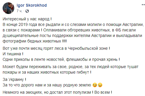 Скороход нагадав, що в кінці 2019 року всі переживали за пожежі в Австралії, викладали фото з обгорілими тваринами. "Ось вже майже місяць горять ліси в Чорнобильській зоні! І тиша!... Може, будемо переживати за своє, рідне, за тих людей які гасять пожежі і за наших тварин, які гинуть! За Україну!", - емоційно закликав українців Ігор Скороход.