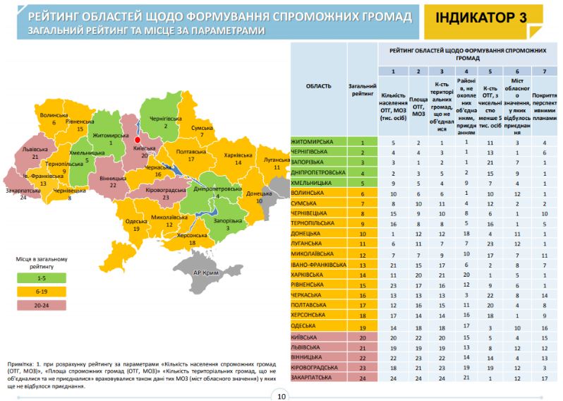Щомісяця Мінрегіон готує моніторинг процесу децентралізації влади та реформування місцевого самоврядування. В рамках цього моніторингу формується рейтинг областей щодо формування спроможних громад. Після того, як оновлений Перспективним план покрив ОТГ усю територію Донецької області, для регіону покращились окремі показники. Донецька область увійшла до переліку лідерів за показником покриття об’єднаними громадами в Перспективному плані та стала на одну сходинку з іншими 7 областями. За загальним рейтингом областей щодо формування ОТГ Донеччина посідає десяте місце.