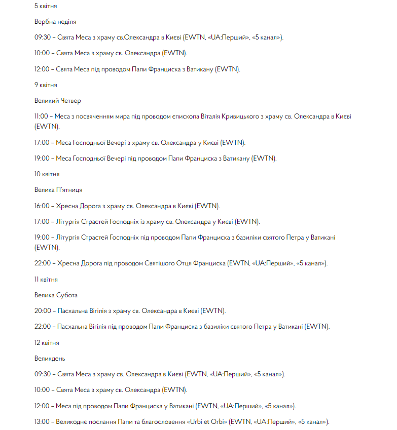 Зокрема, сьогодні можна буде переглянути Святу Месу з храму св. Олександра в Києві а опівдні розпочнеться Свята Меса під проводом Папи Франциска з Ватикану. Трансляцію анонсував також християнський сайт CREDO.