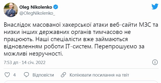 Він зазначив, що внаслідок атаки веб-сайти МЗС та низки інших державних органів наразі тимчасово не працюють. Фахівці вже займаються відновленням роботи ІТ-систем. У МОН також повідомили про атаку на сайт. Зараз тривають відповідні роботи з усунення несправності, а також працює Кіберполіція та СБУ.