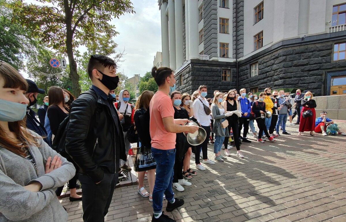 Перед входом до будівлі уряду громадяни вирішили організувати акцію та продемонструвати свою незгоду з карантинними обмеженнями. Вони наголосили, що ресторан "Велюр", який може належати депутату Миколі Тищенку, постійно працює під час карантину.