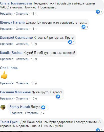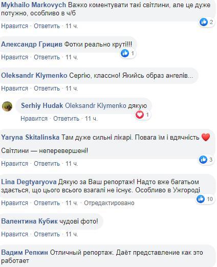 Користувачі відгукнулися на публікацію із захопленням. "Важко коментувати такі фотографії, але це дуже потужно, особливо в ч/б", "Фотки реально круті!!!", "Сергій, класно! Якийсь образ ангелів", "Там дуже сильні лікарі. Повага їм і вдячність ❤️ фотографії — чудові!", "Спасибі за ваш репортаж! Надто вже багатьом здається, що цього всього взагалі не існує. Особливо в Ужгороді", "Відмінний репортаж. Дає уявлення як це працює", "Переглянула та асоціація з ліквідаторами ЧАЕС виникла. Потужно. Пронизливо", "Дай Боже всім нам бути здоровими та розсудливими. А справжнім медикам — шана і низький уклін", - емоційно відреагувала інтернет-спільнота на фото журналіста.