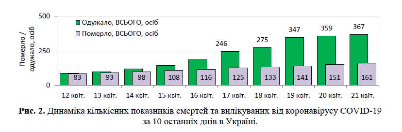 За даними на сьогодні, 21 квітня , в Україні показник смертності від коронавірусу становить 2,6%. Число тих, хто одужав, значно перевищує тих, хто помер.