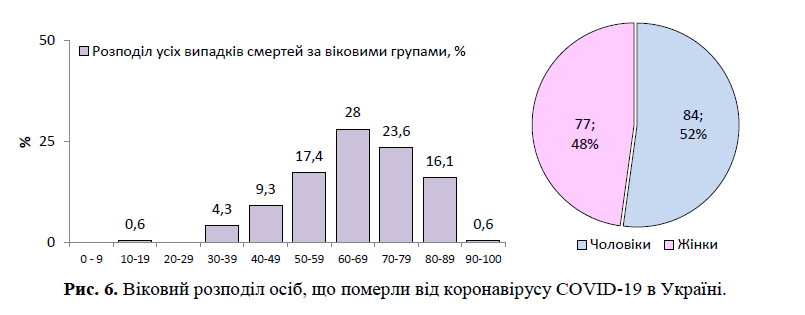 Розподіл смертей за віковими групами: 0-9 років – 0%; 10-19 років – 0,6%; 20-29 років – 0%; 30-39 років – 4,3%; 40-49 років – 9,3%; 50-59 років – 17,4%; 60-69 років – 28%; 70-79 років – 23,6%; 80-89 років – 16,1%; 90-100 років – 0,6%. 48% з усіх померлих – жінки, 52% – чоловіки.