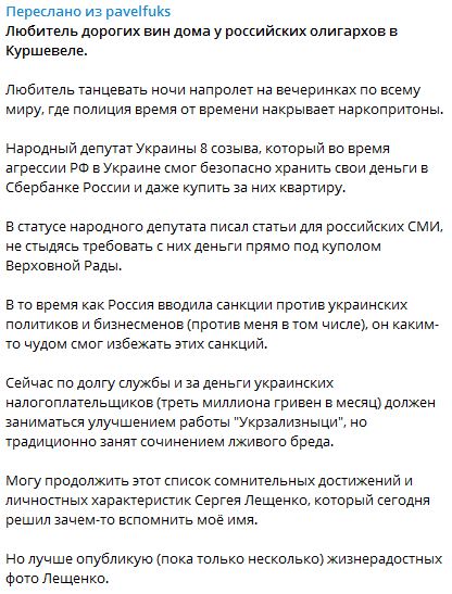 Павло Фукс у своїй публікації зазначив, що в РФ були введені санкції проти нього. "У той час як Росія вводила санкції проти українських політиків і бізнесменів (проти мене, в тому числі), він (Лещенко, прим. ред.) якимось дивом зміг уникнути цих санкцій", - написав меценат увечері 13 липня. Крім того, Фукс підкреслив, що Лещенко "зараз за службовим обов'язком і за гроші українських платників податків (третина мільйона гривень на місяць) повинен займатися поліпшенням роботи "Укрзалізниці", але традиційно зайнятий твором брехливого марення".