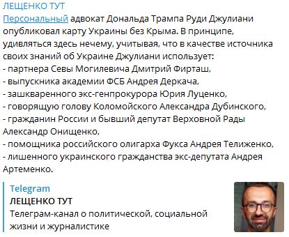 Пост Фукса з'явився після публікації Сергія Лещенка в Телеграм–каналі 13 липня. Лещенко повідомив, що в США адвокат президента Дональда Трампа Рудольф Джуліані опублікував карту України, на якій був відсутній півострів Крим, анексований у 2014 році Російською Федерацією. Лещенко у своїй публікації повідомив, що нібито Джуліані використовує інформацію про Україну запозичуючи її, в тому числі, і у "помічника російського олігарха Фукса Андрія Теліженка".