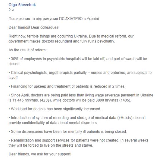 Увечері в четвер, 30 квітня, медики київської клінічної лікарні “Психіатрія” опублікували звернення англійською мовою в Facebook. У ньому вони перерахували наслідки другого етапу медичної реформи Уляни Супрун для української психіатрії.