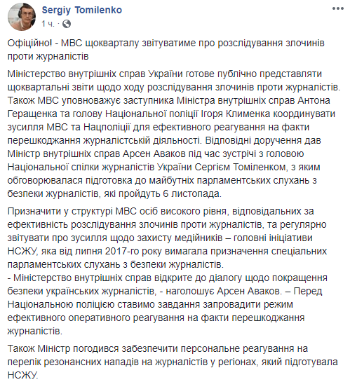 За його словами, МВС уповноважує заступника міністра внутрішніх справ Антона Геращенка та голову Національної поліції Ігоря Клименка координувати зусилля МВС та Нацполіції для ефективного реагування на факти перешкоджання журналістській діяльності.