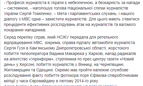 Про це повідомив у п'ятницю у Facebook голова Національної спілки журналістів України (НСЖУ) Сергій Томіленко.