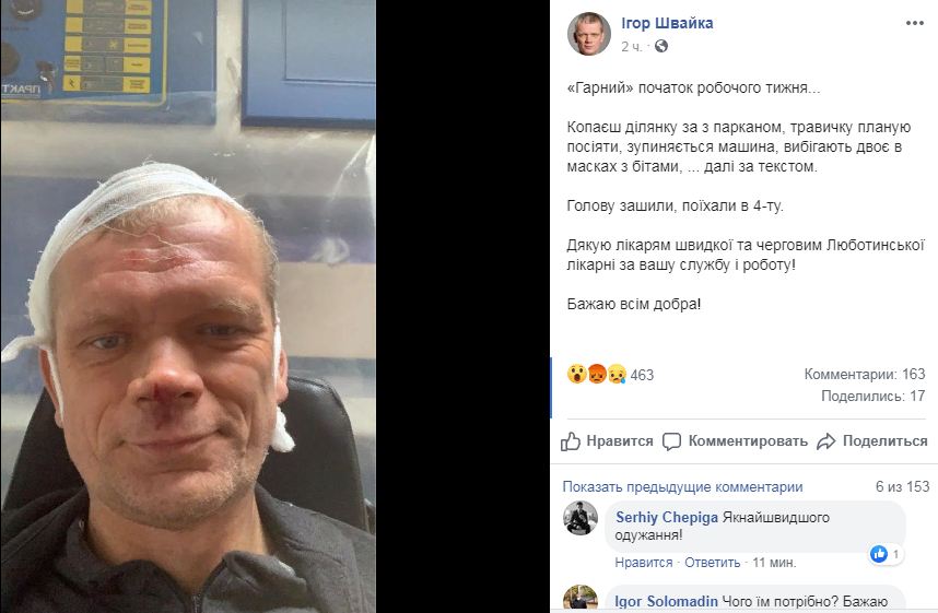 "Гарний" початок робочого тижня. Копаєш ділянку за парканом, травичку планую посіяти, зупиняється машина, вибігають двоє в масках з битами. Далі по тексту. Голову зашили, поїхали в 4-ту", - написав Швайка.