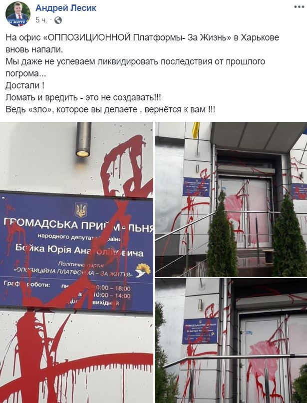 Водночас ексдепутат Харківської міськради Андрій Лесик заявив, що невідомі знову напали на офіс Опозиційної платформи — За життя.