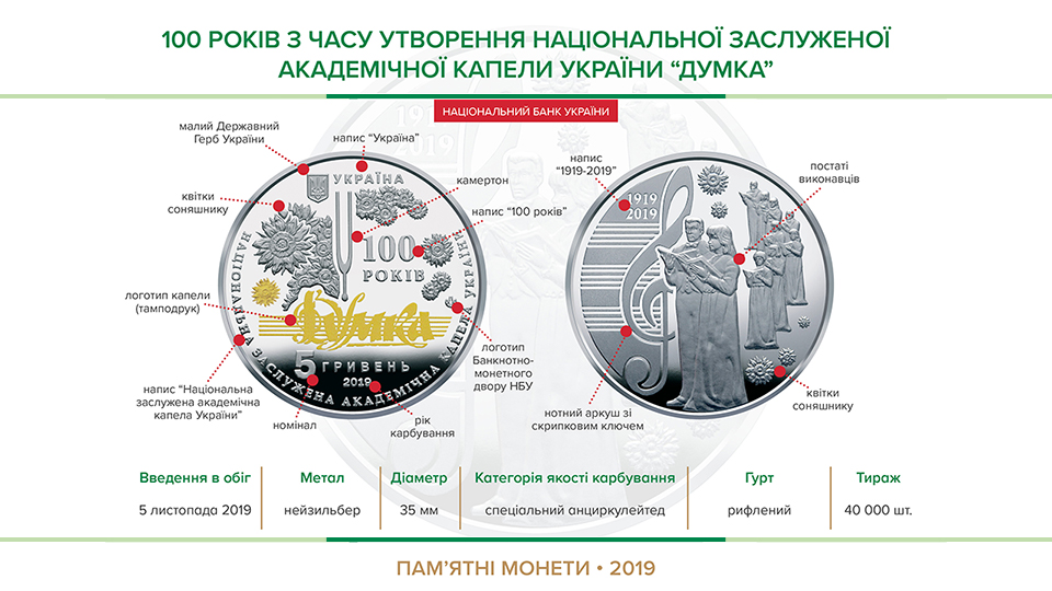 Монета "100 років з часу утворення Національної заслуженої академічної капели України "Думка" також з нейзильбера. Тираж – 40 тисяч штук. Роздрібна ціна – 61 гривня.