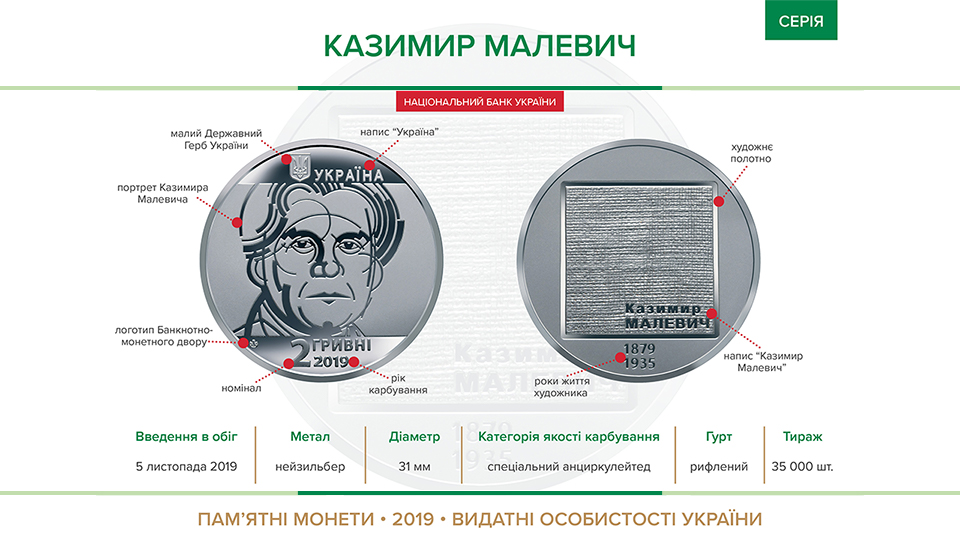 Як розповіли в НБУ, роздрібна ціна монети "Казимир Малевич" – 41 гривня. Вона виготовлена з нейзильбера. Тираж – 35 тисяч штук.