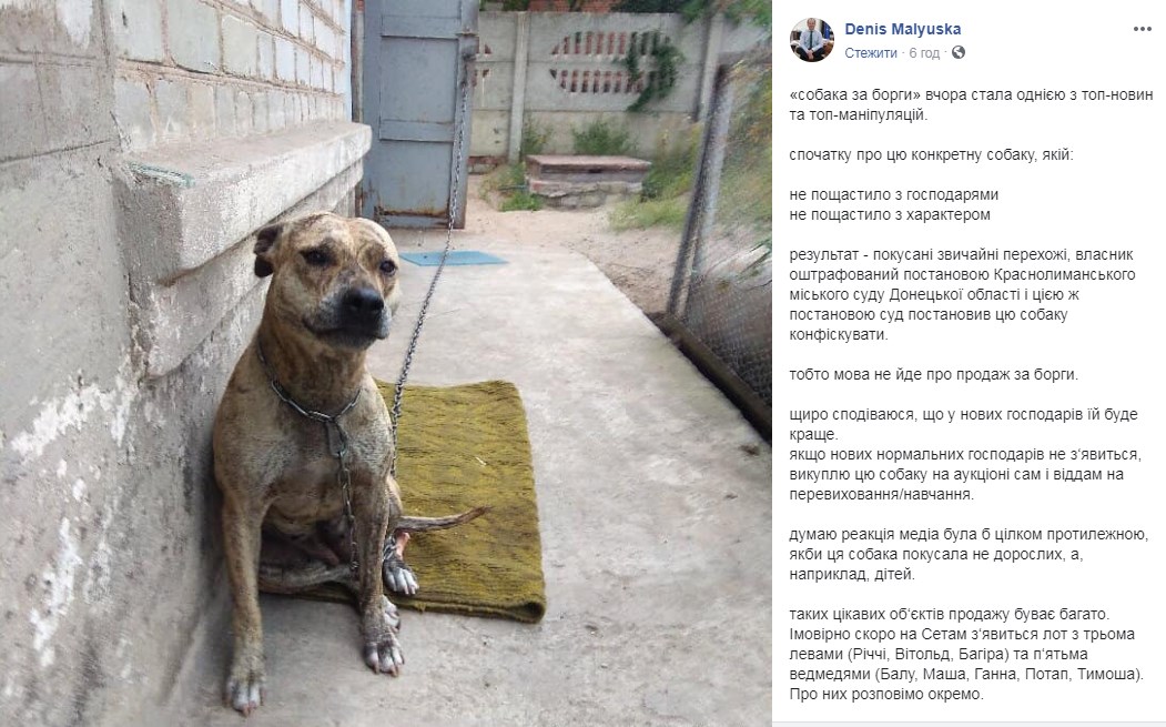 "Спочатку про цю конкретну собаку, якій: не пощастило з господарями, не пощастило з характером, результат – покусані звичайні перехожі, власник оштрафований постановою Краснолиманського міського суду Донецької області й цією ж постановою суд постановив цю собаку конфіскувати. Тобто мова не йде про продаж за борги. Щиро сподіваюся, що у нових господарів їй буде краще”, – додав Малюська.
