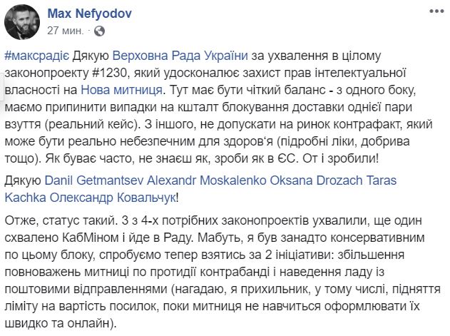 "3 з 4-х потрібних законопроєктів ухвалили, ще один схвалено Кабміном і йде в Раду. Мабуть, я був занадто консервативним по цьому блоку, спробуємо тепер взятись за 2 ініціативи: збільшення повноважень митниці по протидії контрабанді і наведення ладу із поштовими відправленнями (нагадаю, я прихильник, у тому числі, підняття ліміту на вартість посилок, поки митниця не навчиться оформлювати їх швидко та онлайн)", зазначив Нефьодов.