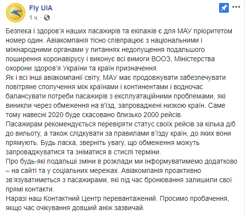 Пандемія коронавірусу: МАУ відміняє дві тисячі авіарейсів