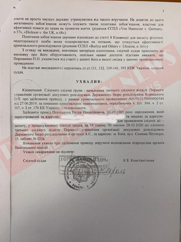 "Здійснити привід Порошенка Петра Олексійовича для проведення слідчої дії – допиту, у процесуальному статусі свідка, на 14 годину 28.02.2020 до слідчого Державного бюро розслідувань. Виконання ухвали про здійснення приводу доручити відповідним підрозділам органів Національної поліції. Ухвала оскарженню не підлягає", – зазначено в рішенні суду.