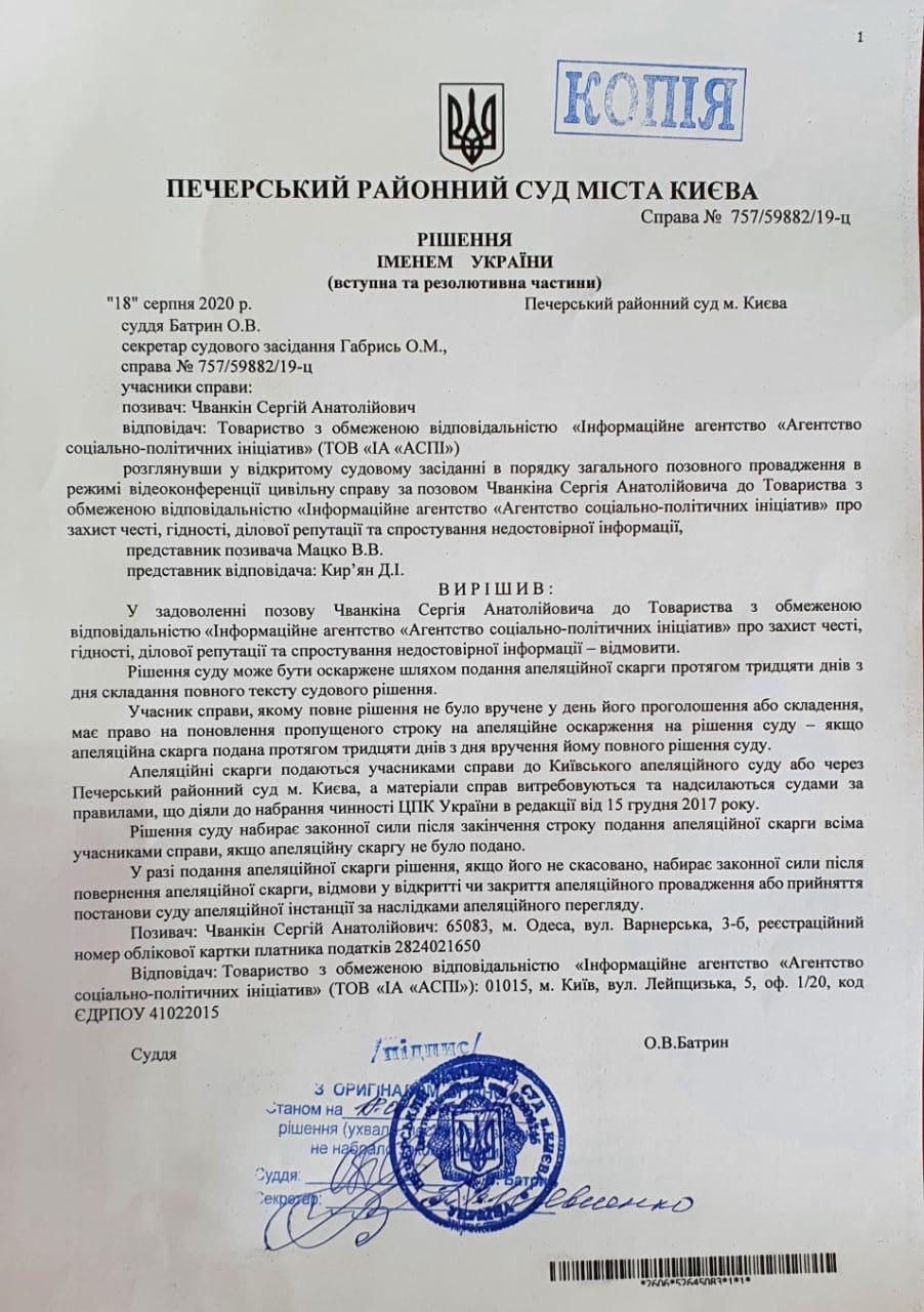 Але в Україні є правосуддя! Печерський районний суд міста Києва 18 серпня поставив крапку у справі №757/59882/19-ц. Цитуємо резолютивну частину: "Розглянувши у відкритому судовому засіданні цивільну справу за позовом Чванкіна Сергія Анатолійовича до ТОВ "ІА "АСПІ" про захист честі, гідності, ділової репутації та спростування недостовірної інформації – ВІДМОВИТИ". Тепер редакція ASPI news очікує на неупереджені дії правоохоронних органів, зокрема, ДБР, яке повинно розслідувати справу Сергія Чванкіна та його "покровителів" до логічного кінця.