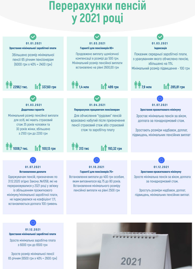 - Встановлення доплати 100 гривень для осіб, яким були назначені пенсії до 31 грудня 2020 року, які не були перераховані у зв'язку зі збільшенням прожиткового мінімуму, мінімальної зарплати та не індексувалися на коефіцієнт 1,11.